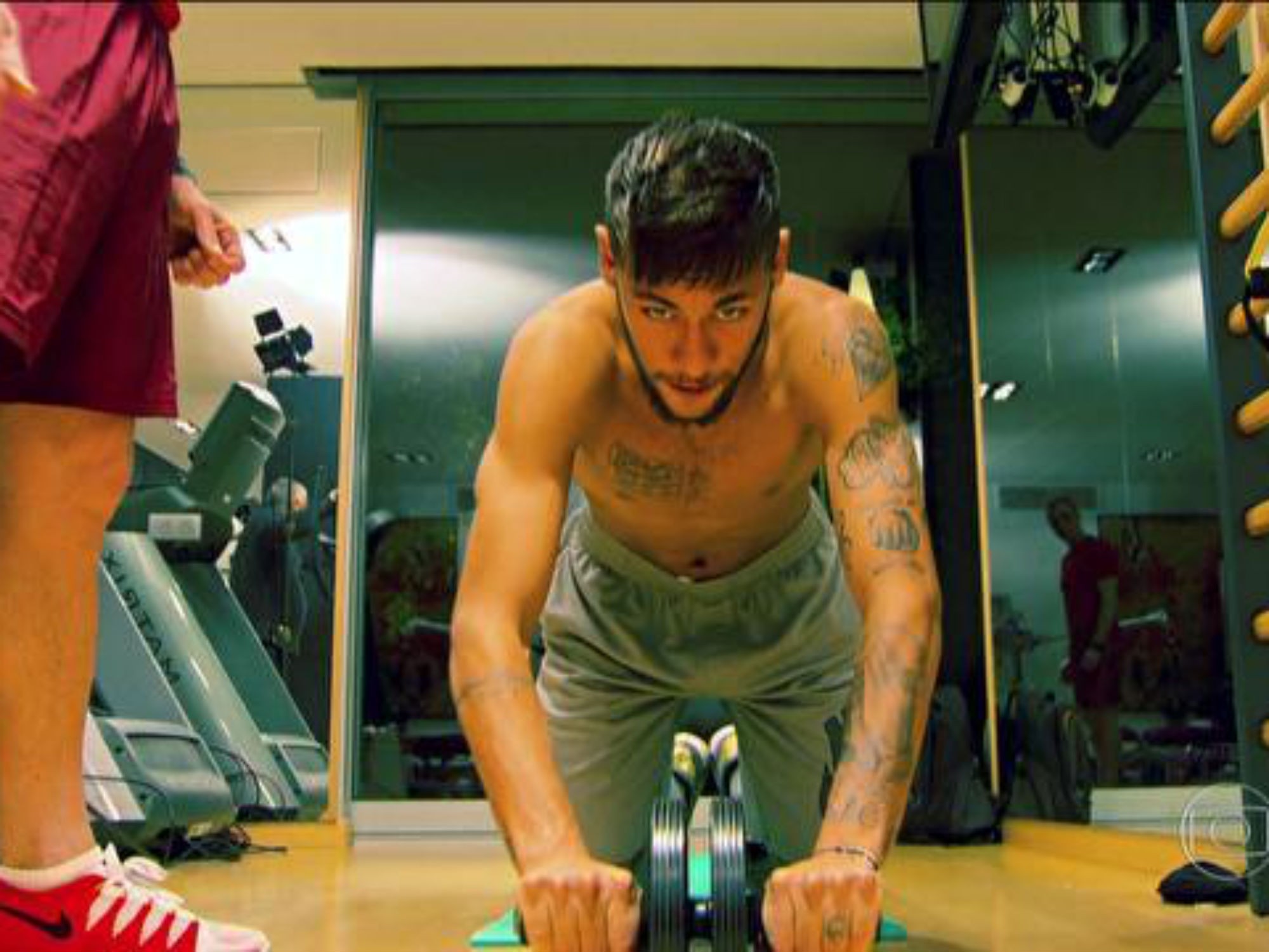 A sala, cheia de aparelhos sofisticados de última geração, até parece uma academia para muitos alunos. Mas não, é inteira e exclusiva do camisa 10 da Seleção. A rotina não é secreta. Em sua casa, em Barcelona, e com o consentimento do clube, Neymar dá continuidade aos exercícios com a supervisão dos profissionais Ricardo Rosa, preparador físico, e Rafael Martini, fisioterapeuta, que ele mesmo escolheu e levou do Brasil. Em entrevista exclusiva para o Esporte Espetacular, o craque mostrou sua casa na Espanha pela primeira vez, falou do momento de solteiro, do assédio das fãs, do filho, da vida, e diz ter amadurecido muito com as decepções enfrentadas em 2014.