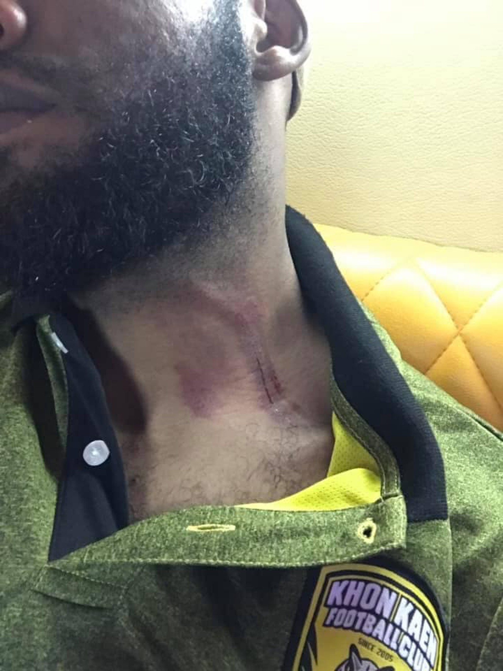O atacante Thales Lima sofreu uma entrada para lá de violenta na segunda divisão da Tailândia no último fim de semana. O brasileiro, que defende o Khon Kaen, foi atingido no pescoço ao dividir a bola com um marcador do Rayong, que acabou expulso diretamente pelo árbitro.
