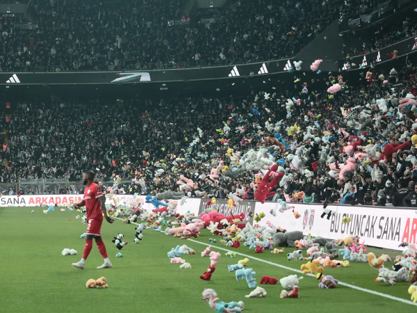 Os torcedores do clube turco Besiktas jogaram milhares de ursos de pelúcia para dentro do campo neste domingo (26) como forma de doação para as crianças sobreviventes dos terremotos na região sul do país.
