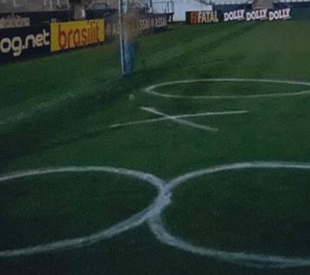 A reportagem apurou que a pichação estava sendo removida na manhã desta quarta. A demarcação das linhas é refeita no dia dos jogos, daí o motivo de as redes do gol que aparece ao fundo estarem encolhidas.