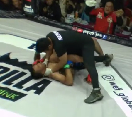 O lutador Doolotbek Narmatov aparentemente não está por dentro dessas normas. No WEF Selection 35, no Quirguistão, na última quarta-feira, o quirguistanês pegou o uzbeque Saidburkhon Saidakbarova numa guilhotina justíssima em apenas 1m30s de luta e forçou os tapas em desistência. O árbitro observou os tapinhas e rapidamente interveio, mas Narmatov não soltou.