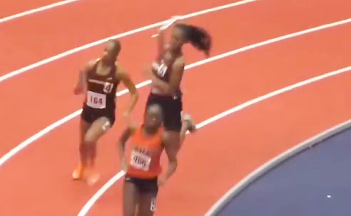 Uma prova de revezamento de atletismo nos Estados Unidos teve um final inesperado. A corredora Kaelen Tucker, de 16 anos, foi atingida na cabeça pelo bastão de uma competidora durante a prova de 4x200m e precisou deixar a pista.
