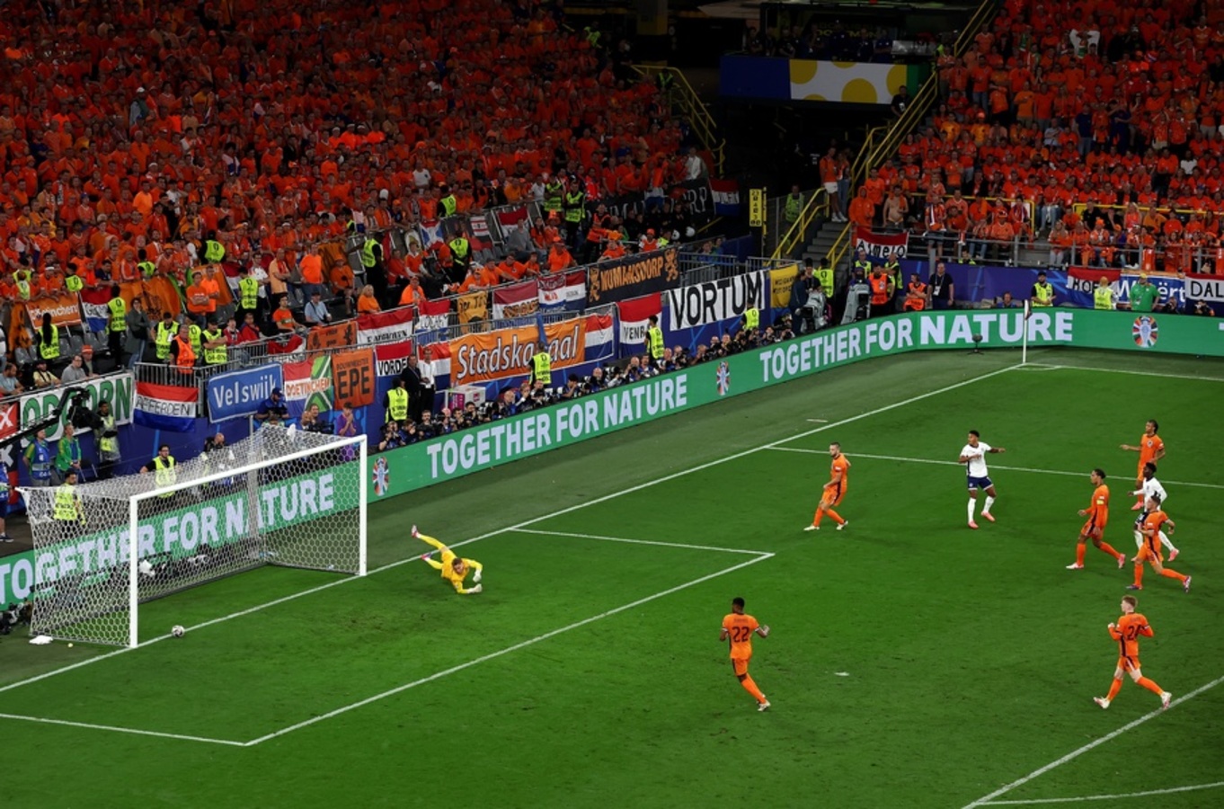 Os dois primeiros gols aconteceram ainda no primeiro tempo, com o da Holanda sendo marcado por Xavi Simons, com um chutaço de fora da área, e o de empate por parte da Inglaterra sendo marcado por Harry Kane, de pênalti. O segundo tempo foi de muita pressão por parte da seleção inglesa, mas o gol só foi sair no fim do tempo regulamentar.