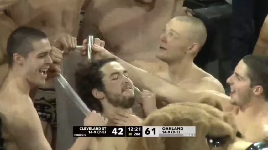 Quando se trata de encontrar maneiras de provocar adversários, os torcedores muitas vezes surpreendem. No basquete universitário dos Estados Unidos (NCAA), os fãs do Oakland Golden Grizzlies adotaram uma estratégia bastante peculiar no sábado (3): raspar o cabelo de um rapaz para distrair os jogadores do Cleveland State Vikings durante cobranças de lances livres. Em pelo menos uma ocasião, a tática mostrou-se eficaz, resultando em uma vitória por 83 a 71 para o Oakland (Confira o vídeo abaixo).
