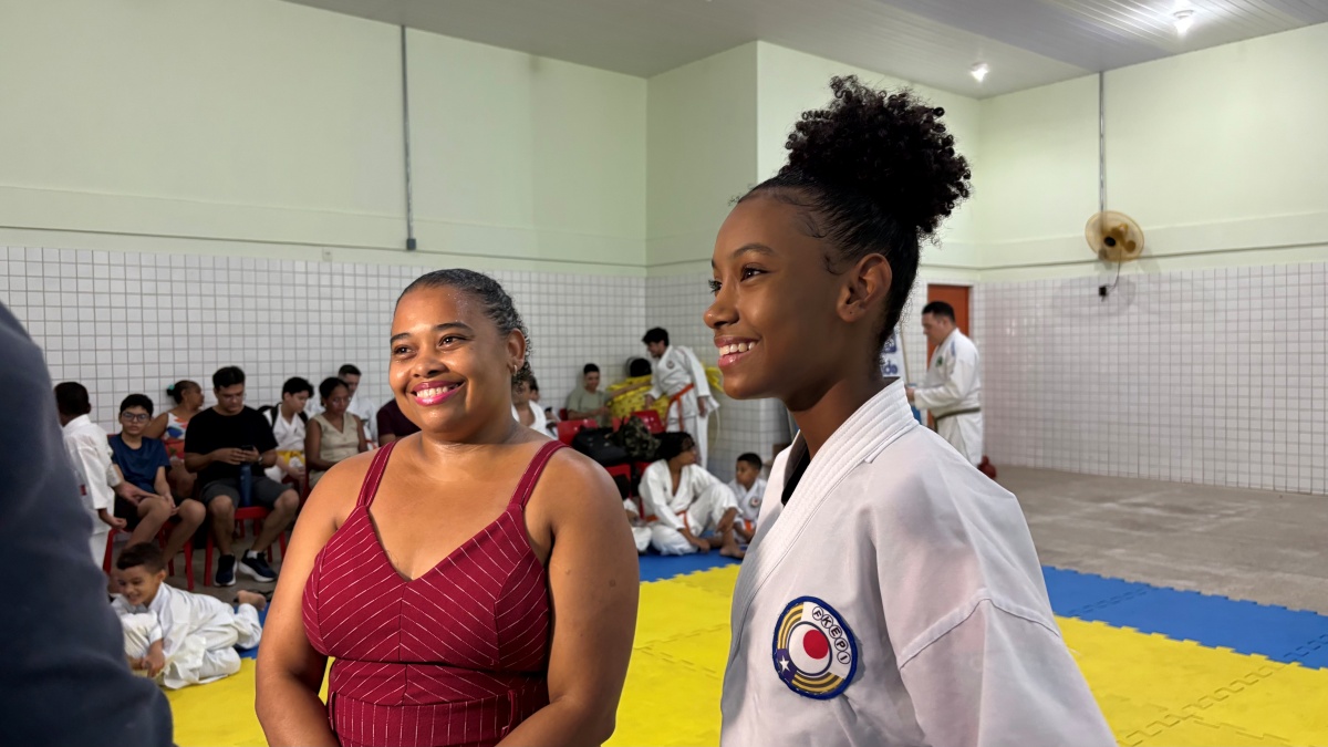Karateca João Batista participa da cerimônia de troca de faixa ao lado da mãe, Valdete Gomes (Foto: Brígida Lira/ Meio News)