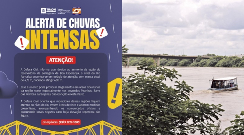 A Prefeitura de Timon divulgou nesta terça-feira (10), por meio de suas redes sociais, um alerta da Defesa Civil sobre a elevação do nível do Rio Parnaíba. O comunicado informa que o rio entrou em estágio de atenção após o aumento da vazão do reservatório da Barragem de Boa Esperança.