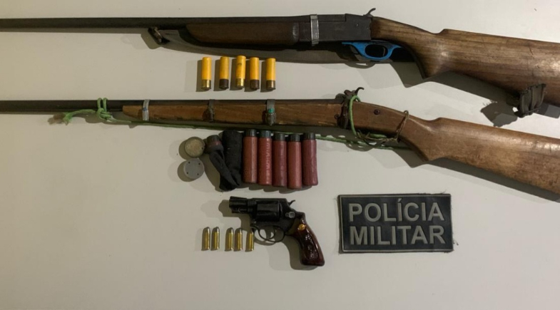 Foram apreendidas também uma espingarda artesanal tipo bate bucha, uma espingarda calibre 20 semi-industrial, além de pólvora, chumbo, espoletas e cinco cartuchos calibre 20, que estavam em posse de Daniel Gomes de Oliveira, 38 anos, e do menor de 17 anos, identificado apenas pelas iniciais J. da S. S.