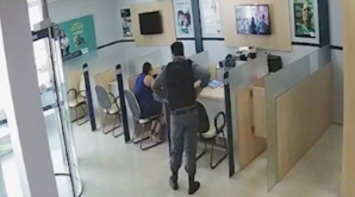 Nas imagens, o homem aparece vestindo a farda da PM, com uma arma em mãos. Ele fica parado por alguns minutos, conversa com uma funcionária e, em seguida, rende o segurança e dois atendentes. Em determinado momento, ele chega a deixar a arma cair no chão.