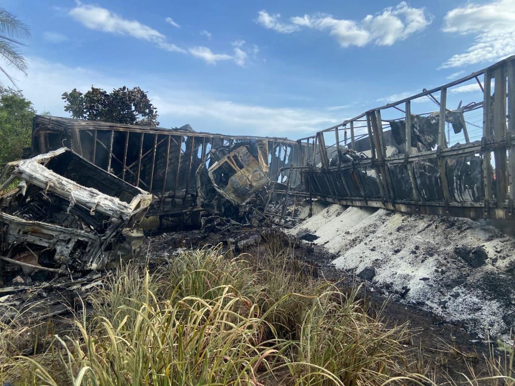 Uma colisão envolvendo dois caminhões deixou dois mortos e os veículos totalmente destruídos na BR-010, no município de Carolina, no interior maranhense. As vítimas são os motoristas, e um deles ficou totalmente carbonizado, segundo a Polícia Rodoviária Federal (PRF). O acidente ocorreu na manhã deste sábado (22).