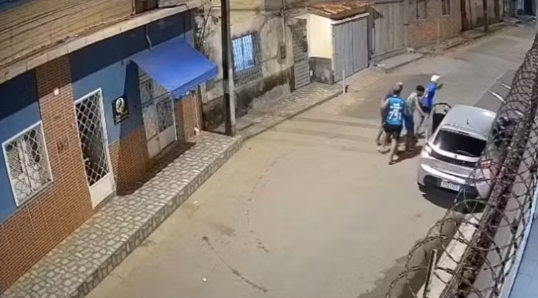 As imagens mostram o veículo parado na rua quando os suspeitos se aproximam correndo. Em seguida, cercam o carro e tentam assaltar a vítima. Assustadas, a mulher e a criança começam a gritar, chamando a atenção de moradores da região.