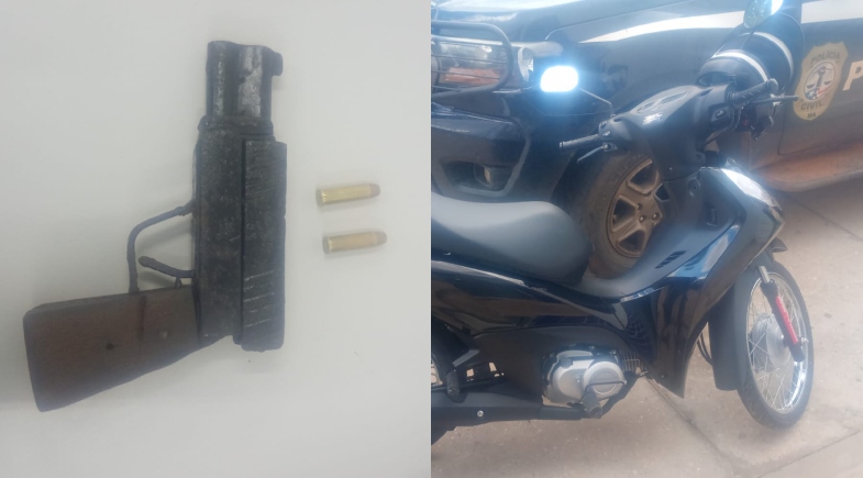 Durante a abordagem, foi constatado que o criminoso portava uma arma de fogo de fabricação artesanal, municiada com dois cartuchos calibre .38. Além disso, ele estava em posse da motocicleta com restrição de roubo.
