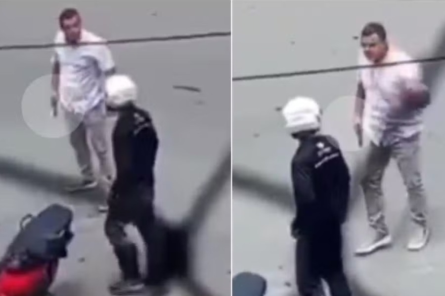 Em determinado momento, o homem derruba o motoqueiro e faz ameaças com a arma em punho dizendo: 'O que tu vai fazer?' e 'Tu tá só maconha'.