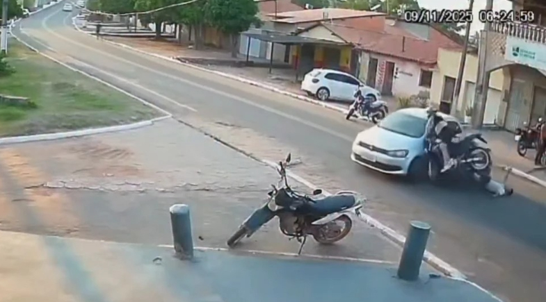 Câmeras de segurança captaram o momento em que duas motos colidem na lateral de um carro que fazia uma manobra na MA-122, no município de Senador La Roque, no Maranhão.
