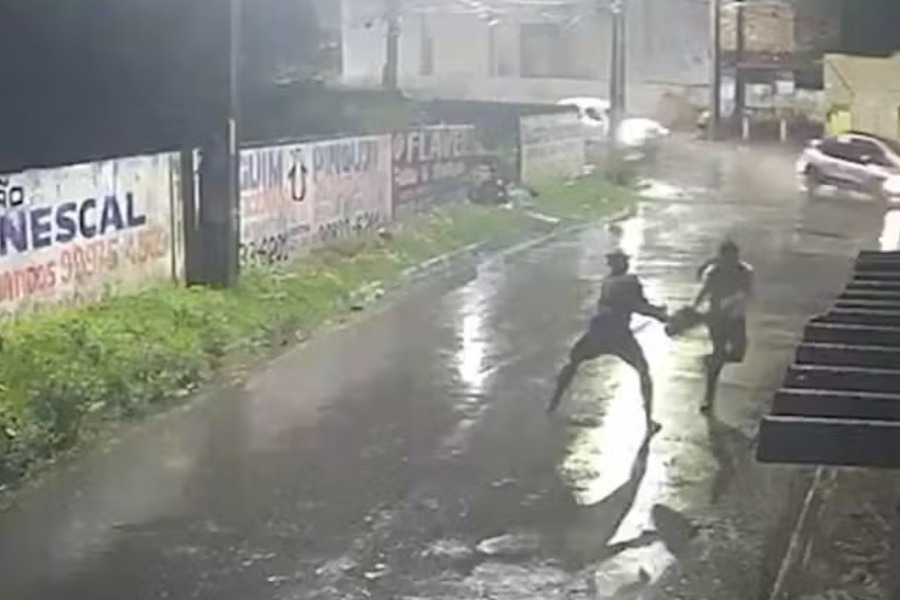 Depois, a vítima já aparece tentando tomar a bolsa que o assaltante havia roubado dela, enquanto isso, o homem tenta golpeá-la com um objeto que aparenta ser uma faca, mas não consegue atingir a mulher.