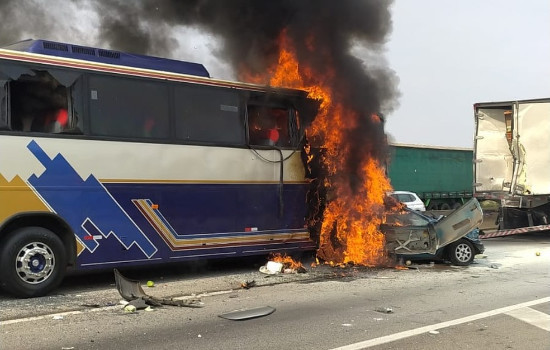 O acidente aconteceu por volta de 9h40 na altura do km 134 da rodovia, na pista sentido São Paulo. De acordo com a Polícia Rodoviária Federal (PRF), no acidente, o caminhão e o ônibus prensaram um carro. Após o acidente, o ônibus entrou em chamas. Um outro carro também se envolveu no acidente.