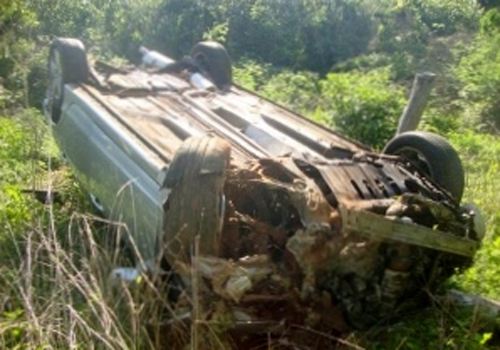 A colisão foi frontal e em consequência do acidente o carro bateu no meio fio, capotou e caiu em um barranco.