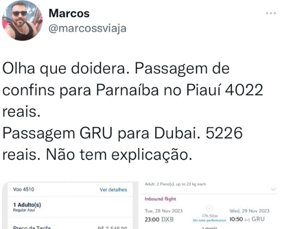 "Olha que doidera. Passagem de confins para Parnaíba no Piauí 4022 reais. Passagem GRU para Dubai. 5226 reais. Não tem explicação", tuitou. Na rede social, o agente revelou que fez o comparativo para mostrar a disparidade de valores do bilhete aéreo.