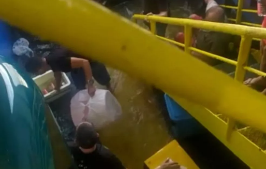 O vídeo, que circula na internet, mostra os passageiros correndo para a parte de cima do ferryboat enquanto a área do estacionamento era tomada pela água.