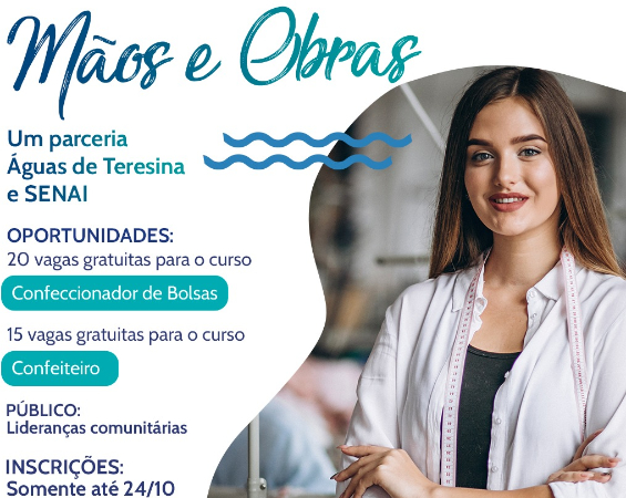 Com a proposta de capacitar pessoas em busca de uma oportunidade no mercado de trabalho, a Águas de Teresina, em parceria com o Senai, oferta 35 vagas gratuitas para os cursos de Confeiteiro e Confeccionador de Bolsas de Tecido. A ação faz parte do programa da concessionária “Mãos e Obras”.