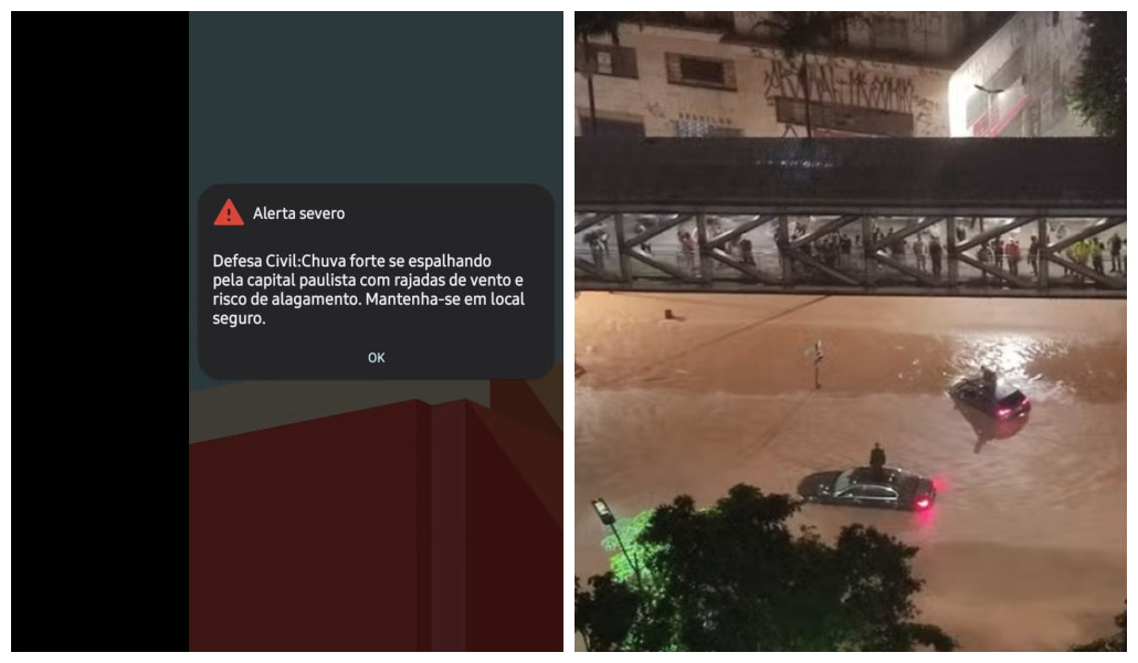 O recado que apareceu para os paulistanos foi: "Defesa Civil: chuva forte se espalhando pela capital paulista com rajadas de vento e risco de alagamento. Mantenha-se em local seguro".