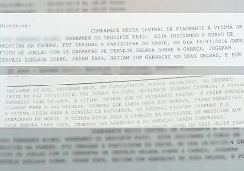 Ainda de acordo com o boletim de ocorrência, veteranos teriam urinado em cima dele, que acabou passando mal e desmaiou. Ele conta que acordou com a ajuda de outros alunos, também veteranos. No dia seguinte, ele voltou na festa e teria sido ameaçado de morte porque disse que iria contar o caso aos diretores da faculdade. Com medo, ele avisou a direção e voltou para a casa dos pais em Contagem (MG).