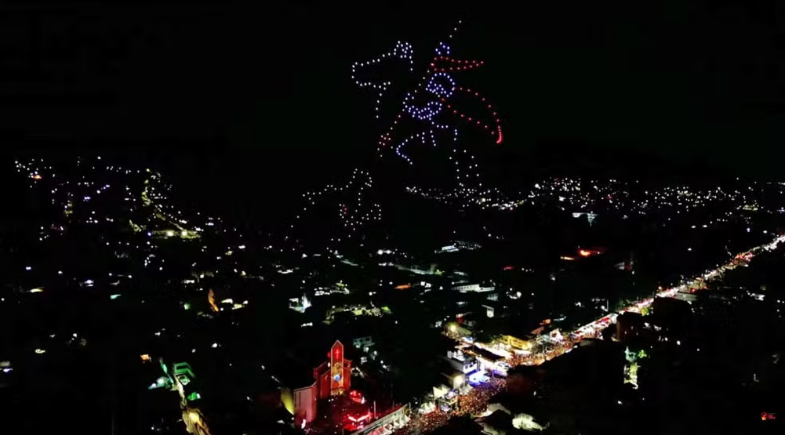Os equipamentos formaram imagens como o dragão, símbolo associado ao Santo Guerreiro, além da figura de São Jorge e mensagens de devoção, entre elas “Salve, Jorge!”. O show atraiu uma multidão à Rua Clarimundo de Melo, que ficou completamente tomada por fiéis.