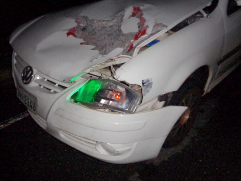 Devido a pouca iluminação do local não foi possível o motorista desviar do animal o veículo teve perda parcial da frente do mesmo,felizmente os ocupantes do veículo nada sofreram.