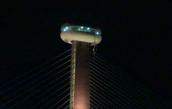 Antena da Ponte Estaiada fica pendurada após fortes ventos e ameaça cair
