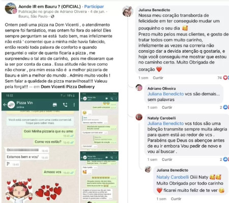 "Ontem pedi uma pizza na Dom Vicenti, o atendimento sempre foi fantástico, mas ontem foi fora do sério! Eles sempre perguntam se está tudo bem, mas infelizmente não está. Comentei que a minha mãe havia falecido, então recebi toda palavra de conforto e quando perguntei o valor de quanto ficaria a pizza, me surpreendeu o tal ato de carinho, pois me disseram que ia ser por conta da casa", contou ele em um grupo de Facebook.