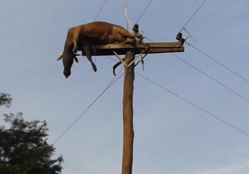 Os restos do animal estão sendo comidos por corvos, segundo o agricultor. Como é necessário passar pelo desponte da barragem para chegar ao poste, com caminhão guincho, e o local ainda contém muita água devido as fortes chuvas que atingiram a região na última semana, não há como remover a vaca.