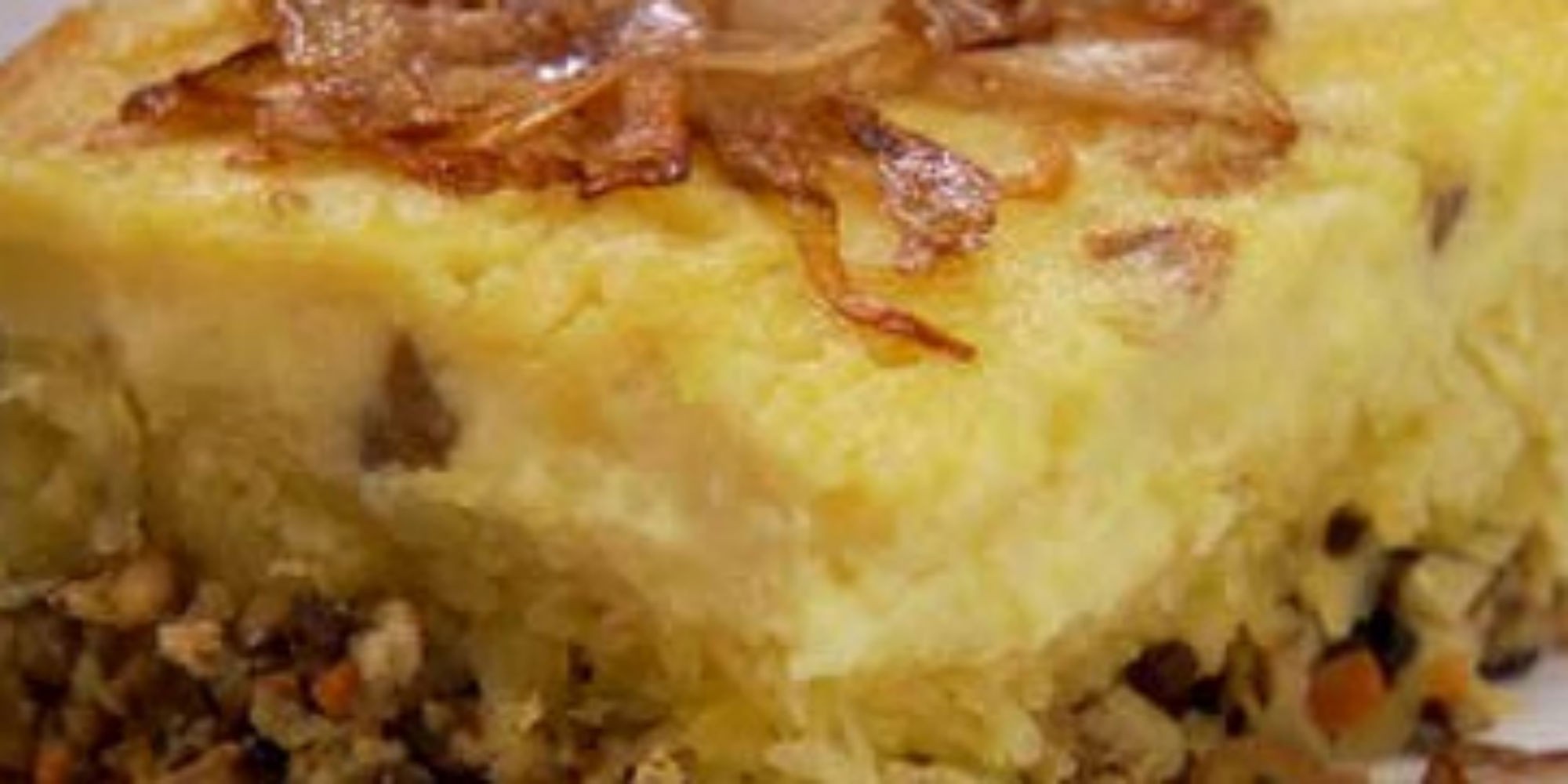 Em uma assadeira de 20 x 28 cm, espalhe com uma colher a mistura de legumes no fundo. Disponha uma camada de abóbora spaghetti e, em seguida, uma camada de batata de maneira uniforme. Cozinhe no forno por cerca de 30 minutos até que a parte de cima esteja levemente dourada. Adicione as chalotas fritas a gosto.