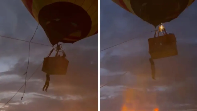 Devido a uma rajada forte de vento, o balão acabou subindo de forma inesperada e rápida, o que levou nosso colaborador a subir junto, segurando pela borda do cesto.