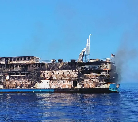 Pouco depois de zarpar, foi declarado um incêndio na balsa, e passageiros e membros da tripulação a pularam no mar.