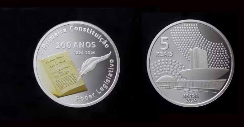 O Banco Central lançou hoje uma moeda comemorativa de R$ 5 em celebração aos 200 anos da criação da primeira Constituição do Brasil. Moeda comemorativa é de prata. A primeira Constituição brasileira é datada de 25 de março de 1824, durante o Brasil Império.