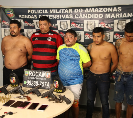 Policiais Militares da Rondas Ostensivas Cândido Mariano (Rocam) prenderam na tarde da última segunda-feira (07), cinco homens em posse de sete armas de fogo em um motel localizado na avenida Torquato Tapajós, zona Sul de Manaus.