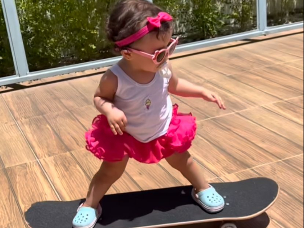O empresário explicou que andava de skate quando era mais jovem e decidiu transferir o amor pelo esporte radical para a filha mais velha, Isabela, de 11 anos. Além de Isabela, a bebê também ficou encantada com as manobras. “A Mirela, vendo a Isabela andar aqui dentro de casa, ficava olhando a irmã. Eu tive a ideia de colocar ela em cima do skate, fui empurrando e foi impressionante. Ela apresentou um equilíbrio fora do normal, de assustar”, falou.