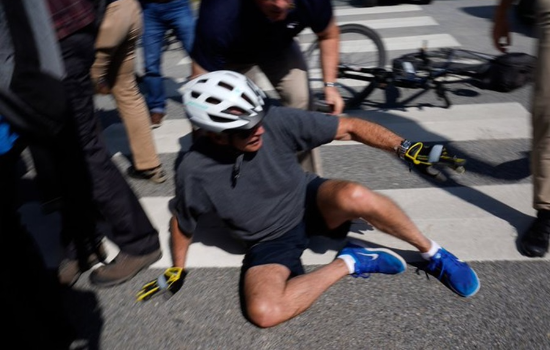 Biden, que tem 79 anos, e a primeira-dama dos Estados Unidos, Jill Biden, estavam no fim de um passeio matinal quando o presidente decidiu pedalar até uma multidão de simpatizantes. Ele usava um capacete e caiu quando tentou sair da bicicleta.