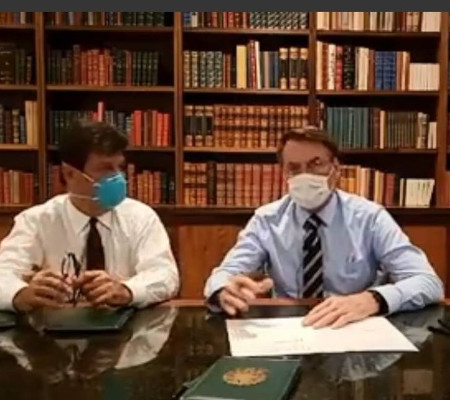 O presidente Jair Bolsonaro apareceu vestindo uma máscara de proteção sobre o nariz e a boca nesta quinta-feira, durante mais uma edição da transmissão ao vivo que promove semanalmente no Facebook. Mais cedo, ele se submeteu a um exame para saber se contraiu o vírus assim como o secretário de Comunicação da Presidência da República, Fábio Wajngarten, diagnosticado com a doença.