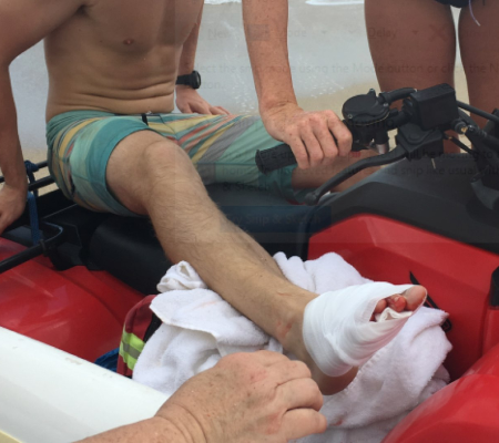 "E por um segundo inteiro, foi preso bem no meu pé e tive que sacudi-lo do meu pé", afirmou a vítima. Kendrick foi socorrido por um homem que usou uma camiseta para estancar o sangramento. Por conta do ferimento, o bombeiro precisou de 37 pontos no pé.