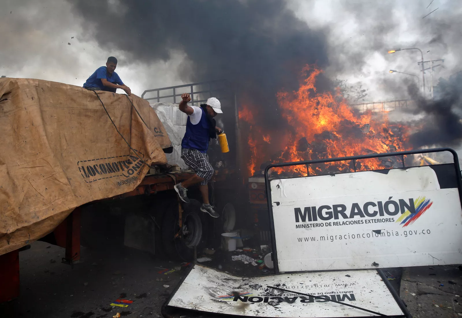 Na fronteira com a Colômbia, 2 caminhões com ajuda humanitária foram incendiados