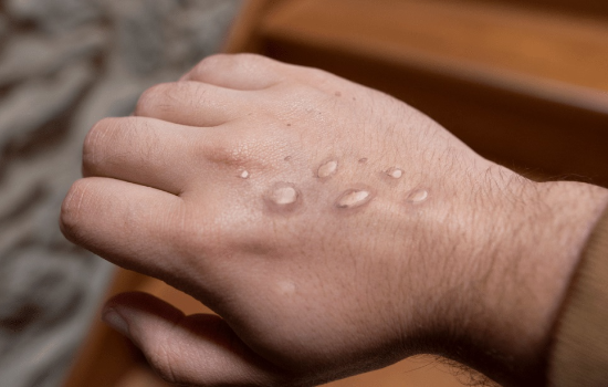 Cerca de um a três dias após a febre, a maioria das pessoas também desenvolve uma erupção cutânea dolorosa característica desse gênero de vírus. A erupção pode começar no rosto, nas mãos, nos pés, no interior da boca ou nos órgãos genitais do paciente e progredir para o resto do corpo.