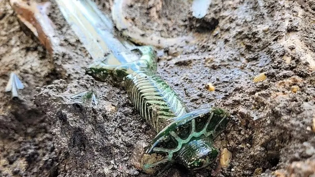 Os especialistas ficaram surpresos com as condições impressionantes da espada, e até o momento não conseguiram determinar a origem exata da peça. A relíquia foi descoberta na semana passada em um túmulo contendo os restos mortais de três indivíduos: um homem, uma mulher e um adolescente.