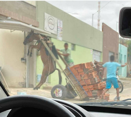 Um burro ficou suspenso em uma carroça com excesso de peso no Bairro Salesianos, em Juazeiro do Norte. O caso ocorreu na manhã desta terça-feira (27), foi fotografado e denunciado à polícia ambiental. Uma equipe do Batalhão de Polícia do Meio Ambiente de Juazeiro do Norte constatou que o animal transportava uma carga pesada de tijolos.