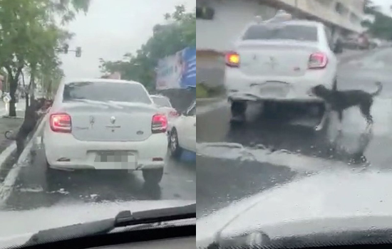 Imagens divulgadas nas redes sociais flagraram um cachorro correndo atrás de um carro depois de ter sido abandonado, durante a chuva na manhã de sábado (15), na Avenida Miguel Rosa, no Centro/Norte de Teresina.