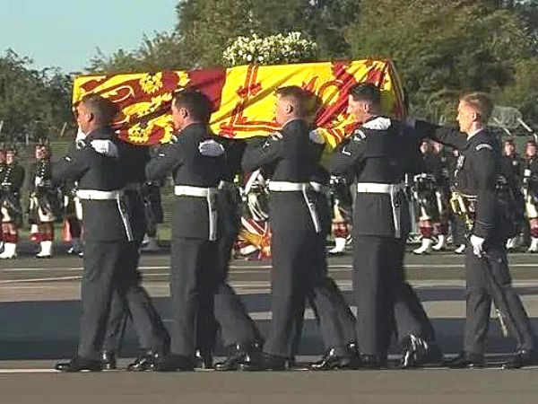 O corpo foi transportado de avião até a base aérea militar RAF Northolt. O rei Charles III, a rainha consorte Camilla e outros membros do clã Windsor esperam a chegada do caixão em Buckingham.