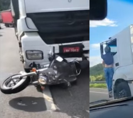 Imagens feitas por outros motoristas, publicadas nas redes sociais, mostram a cena impressionante da moto sendo arrastada e o piloto pendurado na cabine. Segundo a Polícia Rodoviária Federal, a ocorrência aconteceu às 16h, no km 106 da BR 101, no sentido Sul, envolvendo uma carreta Mercedes Benz/Axor de Taquara (RS) e uma moto Kawasaki, cuja placa não foi identificada.