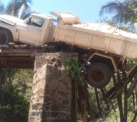 Um caminhão caçamba carregado de areia ficou ‘pendurado’ após uma ponte de madeira não suportar o peso do veículo e quebrar em um estrada da Localidade Burdão, na zona Rural da cidade de Miguel Alves, na manhã desta quinta-feira (10). As informações são do Jornal de Ilha Grande.