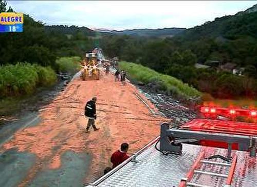 Parte da carga vazou sobre o asfalto e na lateral da pista, como mostra o Bom Dia Rio Grande (veja o vídeo). A Polícia Ambiental espalhou serragem para evitar que o material tóxico atingisse um riacho às margens da estrada. O motorista sofreu ferimentos leves.