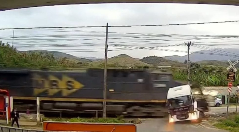Um caminhão foi atingido por um trem ao tentar atravessar a linha-férrea em Vassouras, no Sul do Rio de Janeiro. O acidente aconteceu na tarde da última terça-feira (23), no bairro Vila Ipiranga, e foi registrado por uma câmera de monitoramento. As imagens, que mostram o veículo sendo arrastado por cerca de 50 metros, impressionam e circulam nas redes sociais.