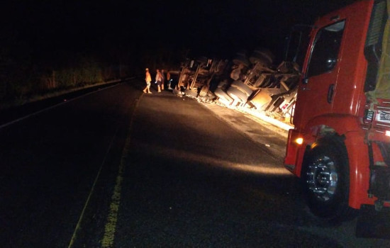 A Polícia Rodoviária Federal (PRF) informou que o veículo de carga era conduzido por um homem, de 30 anos. Ele perdeu o controle do veículo, que em seguida tombou.